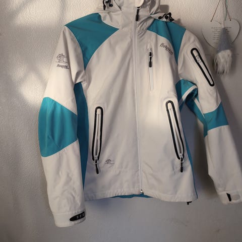 Bergans vinterjakke i blå farge, størrelse S, laget av polyester. Jakken er designet for kvinner og egner seg til bruk i kaldt vær.