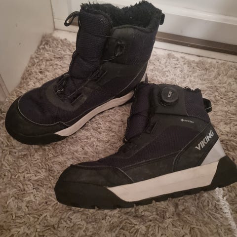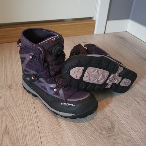 Viking barnesko unisex størrelse 34. Skoene er designet for barn og har en mørk blå/lilla farge med oransje detaljer. Materialet ser ut til å være slitesterkt og egnet for utendørs bruk. Skoene har en lukking med BOA-lukking og robust såle. Godt isolerte. Veldig fornøyd med alle vintersko fra Viking, har kun hatt det oppigjennom.