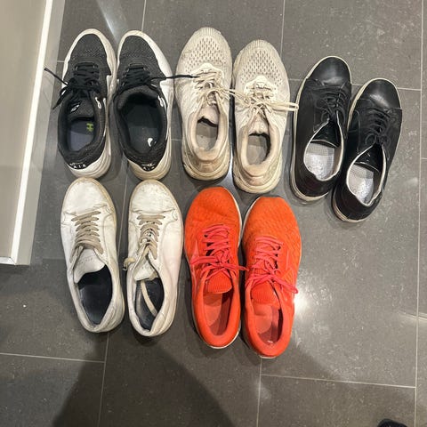 Mønsteret i yttersålen har synelig slitasje ved utsiden av hælen (se bilde 5 og 6) og toppen av hælkappen har begynt å få hull (se bilde 1). Ellers er skoene i relativ god stand.