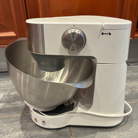 Kenwood kjøkkenmaskin med rustfri stålbolle og to ulike visper for blanding og elting. Maskinen har justerbar hastighet og er egnet for baking og matlaging. Maskinen trenger nok litt rengjøring og stell, men fungerer ellers. Hvitfargen er blitt misfarget/gulnet. Bærer preg av å være brukt. Ukjent alder.