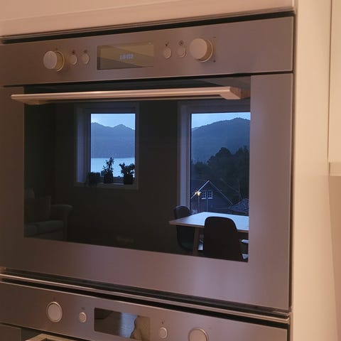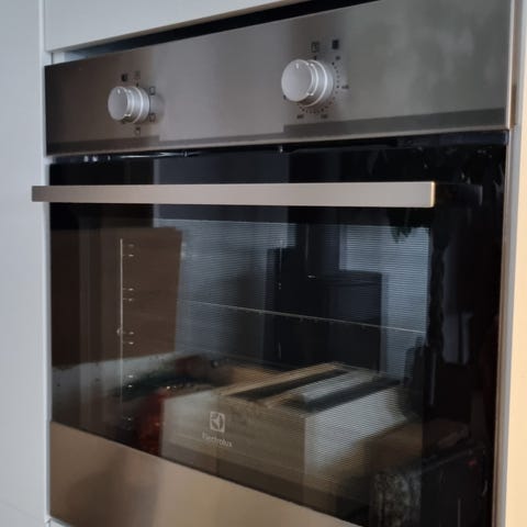 Ovnen er integrert i kjøkkeninnredning og har rustfritt stål front med glassdør.