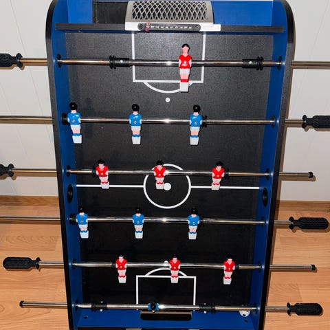 Selger fotballspill da det ikke brukes mere. I ok stand men med bruksmerker, ballen er borte så den følger ikke med. Størrelse er ca 110 cm lengde x 60 cm bredde, Stengene er 112cm. Hentes på Elverum, ferdig prutet.
