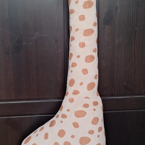 En stor leketøygiraff i myk pilé med applikasjoner og broderte detaljer. Leken har godt utstoppede ben som gjør at den kan stå. Høyde ca. 100 cm. Bredde på det bredeste punktet: ca. 35 cm.