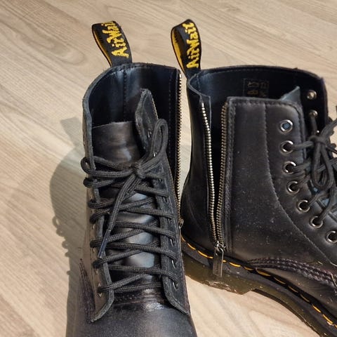kjempekule Dr. Martens str. 38, svart skinn, snøring og glidelås på innsiden, platform.