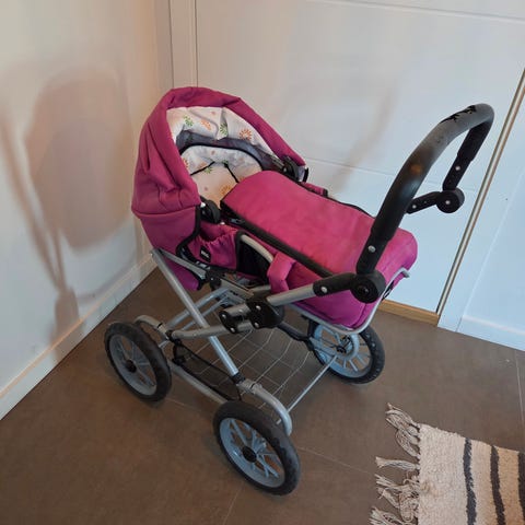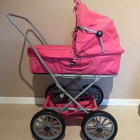 Veldig lite brukt dukkevogn fra brio. Den er støken, utenom gummien på håndtaket som er litt ødelagt. Den kan teipes eller bare ta av hele gummien.