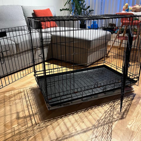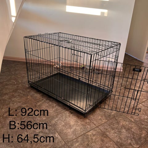 Ozami hundebur i metall som kan legges sammen selges. Følger med en polstret pute fra dogman som kan vaskes i maskin på 30 grader. Buret har dør med låsemekanisme på både kortsiden og langsiden. Høyde 51 cm, bredde 43 cm og lengde 60 cm. Pent brukt da valpen vår vokste raskt fra det.