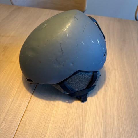 Barnehjelm gis bort. Klipset under øret er brukket, men dette har nok ikke noe å si for funksjonen (se bildet).