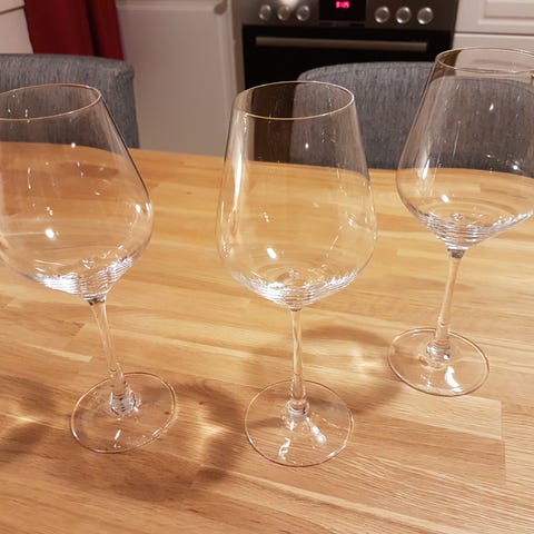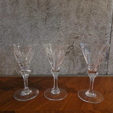 Ett av glassene har et lite nagg på stetten. Ett annet har et par små nagg på kanten.