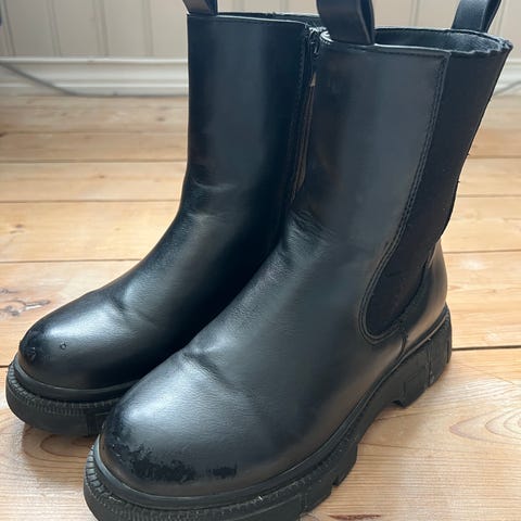 Pent brukte boots fra Pepper i str. 36 selges, de er blitt fravokst altfor fort! Støvlene er i syntetisk skinn, med tynt fleecefor inni. Tåler litt dårlig vær og passer godt som stilige høst/vinterboots. Strikk på utsiden og glidelås på innsiden og en halvgrov såle gir greit grep.