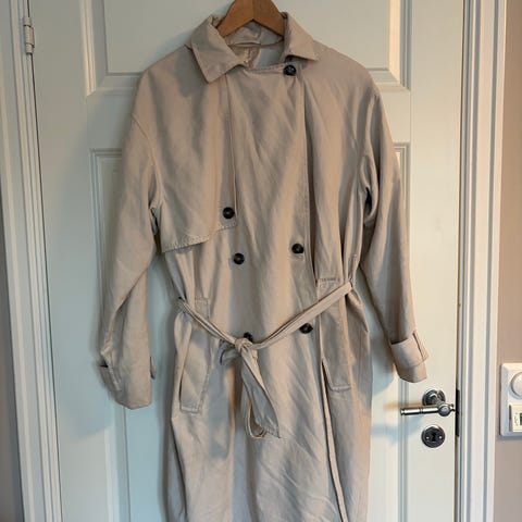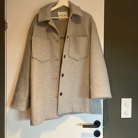 Samsøe Samsøe Hoff jacket 6182. Det er en oversized kåpe, som er halvlang. Farge sand feet mel. Varm og god!