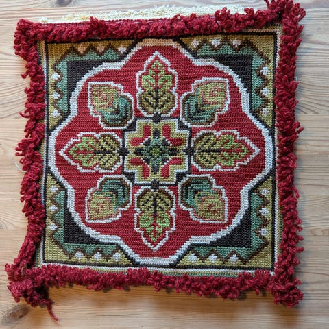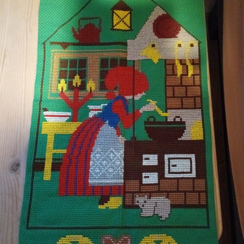 Brodert bilde på stramei. Broderi.