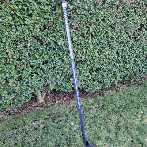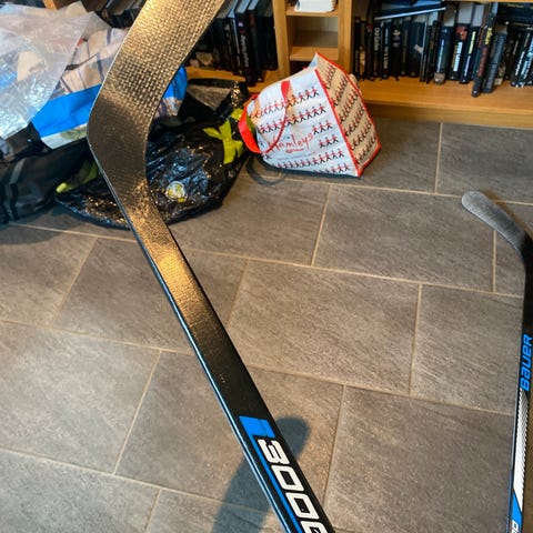 Blå og rød ishockey kølle. Ca. 150 cm lengde.