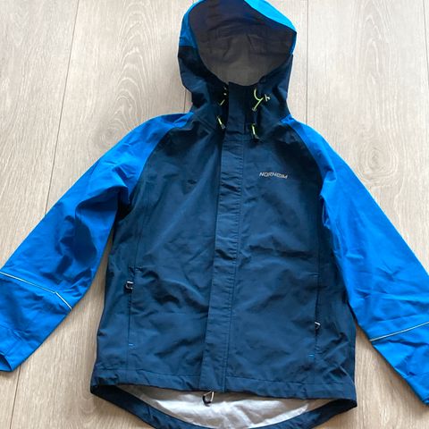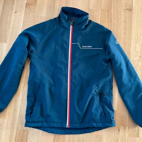 Pent brukt Norheim ytterjakke/alpinjakke til barn str 12 år. Blå. Lite brukt. Ingen synlig slitasje på stoff. Hel glidelås. Mangler en halv trykknapp i snøskjørtet (se bildet)