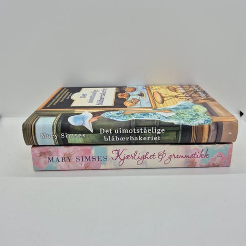To bøker av Mary Simses: "Det uimotståelige blåbærbakeriet" og "Kjærlighet og grammatikk". Selges samlet for 40 kroner eller du kan kjøpe separat for 20 kroner pr. bok.
