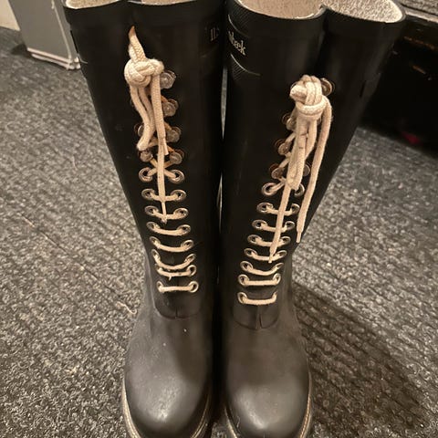 Ilse Jacobsen Hornbæk regnstøvler i størrelse 36. Støvlene er svarte med hvite lisser og er håndlaget.