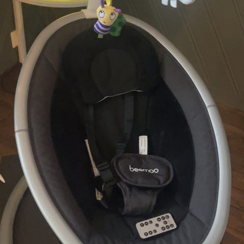 Beemoo Babysitter i grå farge med mykt polstret sete og sikkerhetssele. Egnet for spedbarn og småbarn, designet for komfort og støtte under hvile eller lek.