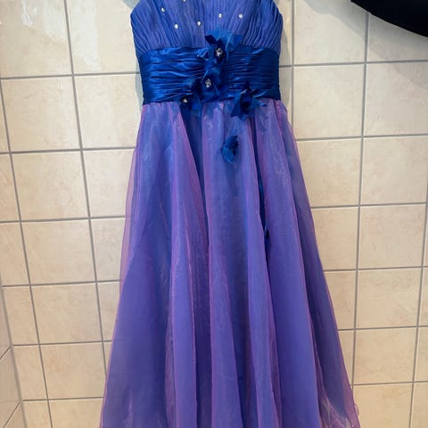 Ballkjole selges. Brukt 1 gang og er ikke synlig brukt, ingen løse krystaller, ingen flekker, ingen bruksskader i skjørtet/tyll. Svært god stand. Fleksibel størrelse pga knyting bak (34-38).