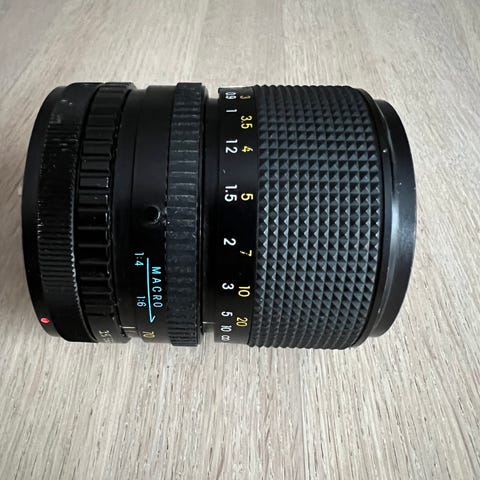 Objektivet fremstår som brukt, men uten tydelige hakk eller riper i glasset etter visuell inspeksjon. Normal kosmetisk slitasje utvendig må påregnes. Fokus- og zoomringer beveger seg.