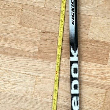 Blå, grå, sølv, sort ishockeykølle. Merke Bauer. Pro carbon-hybrid. Mål 150 cm.