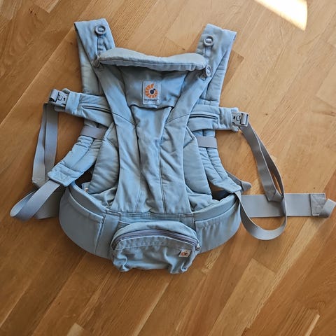 Ergobaby Omni Dream bæresæle i blå. Endte opp med to fordi det ble krøll med HeltHjem