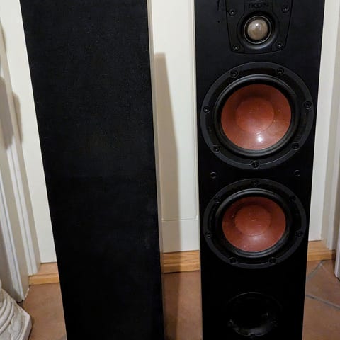 Dali Ikon 5 MK2 gulvhøyttalere i hvit høyglans utførelse. Høyttalerne har to mellomtoner og en diskant, samt tilkoblinger for høyttalerkabler på baksiden. Passer til bruk i hjemmelydsystemer.
