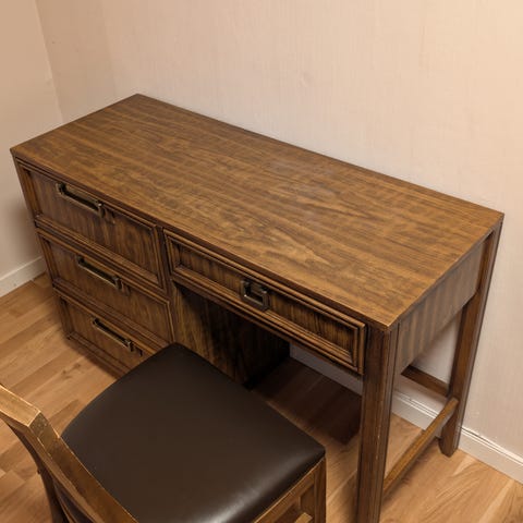 Kult retro skrivebord i lyst treverk med grønne skuffefronter. Samme grønnfarge finnes på "baksiden" av skrivebordet, slik at du kan velge å ha den siden synlig ut mot rommet. Fire romslige skuffer, to av dem er låsbare. (En nøkkel som passer til begge.) Skrivebordet har en del bruksmerker. På bordplaten, der det synes mest, har vi har brukt en tynn korkematte over, som du kan få med om du ønsker. Beina kan skrues av for enklere transport. Hentes sentralt på Tromsøya.