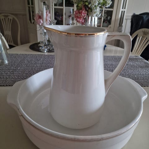 Vaskesettet er helt uten sprekker eller nagg. Hvitt med gullkant. Det består av vaskevannsfat, vannmugge og såpekopp. Pris på vaskesettet er 1200kr. Vinballongen står i originalkurven og er helt hel. Pris vinballong med kurv 500kr