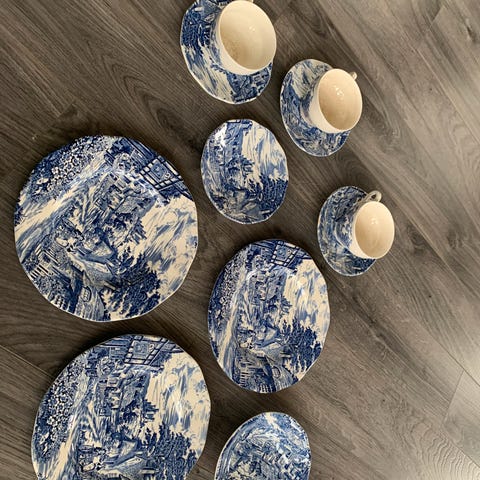6 tallerken,5 kopper med tefat, 2 fat og en skål