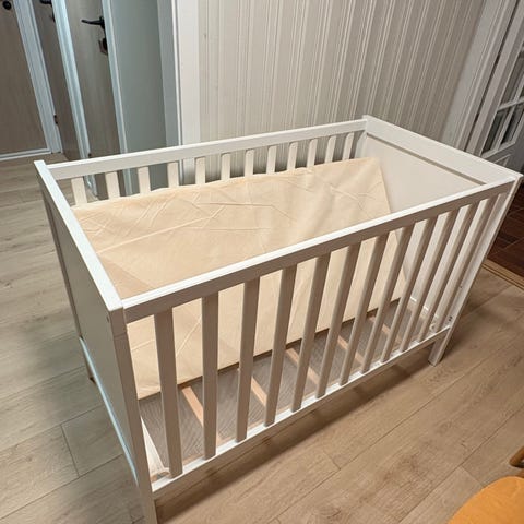 Fin barnevugge. Meier kan tas av slik at blir en seng. Ene siden kan skrus av slik at det blir en liten sofa.
