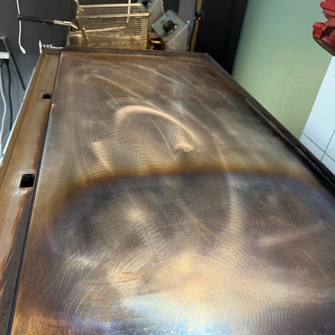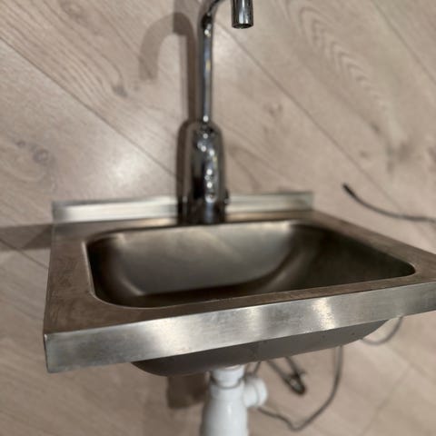 I rustfritt stål med to separate kar, hver med avløpshull. Passer til bruk i kjøkken eller profesjonelle miljøer. Testet alt funker