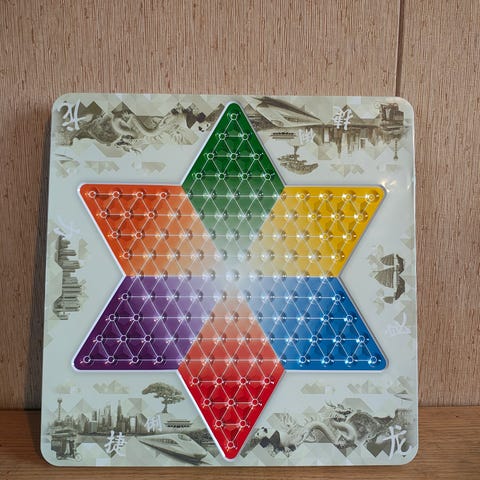 Et godt gammelt Chinese Checkers, trolig fra 1940-tallet. Metallskåler og trekuler tyder på at det er et av de eldste versjonene av Damm 273.