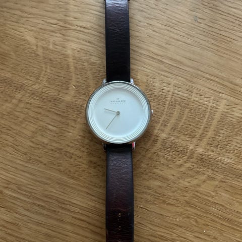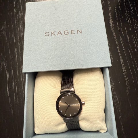Skagen unisex klokke med mesh-armbånd i metall. Klokken har en rund urskive og minimalistisk design.