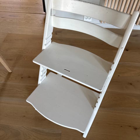 Hvit tripp trapp stol. Kom gjerne og se på den. Masse bruk igjen:)