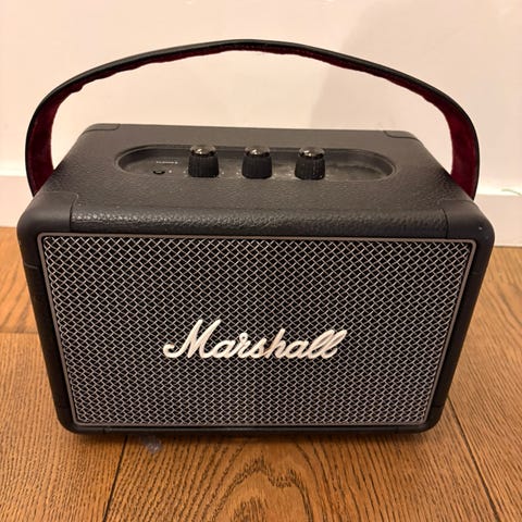Marshall høyttaler i svart farge med tre justeringskontroller på toppen for bass, mellomtone og diskant. Enheten har en ledning for tilkobling til strøm. Designet med klassisk Marshall-logo på fronten.