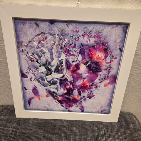Flott blomsterbilde, 73,5 x 73,5 cm. Selve bilde er på en plate, festet til en treramme. Må hentes hos selger.
