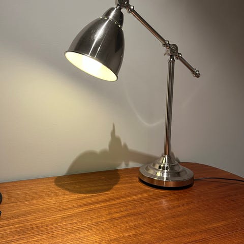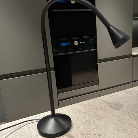 Pent brukt, med av/på bryter på ledningen, kan enkelt settes fast i bord uten å skru i bord/pult.