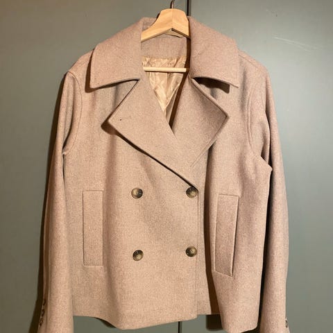 Denne jakken er perfekt for kaldere dager når du fortsatt vil se stilig ut. Den har en elegant krage og et dobbeltspent design som gir den et klassisk utseende. Den korte lengden gjør den både praktisk og trendy. Med lommer skjult i sidesømmene kan du enkelt oppbevare småting. Dette er et nøkkelplagg som lett kan matches med ulike antrekk!