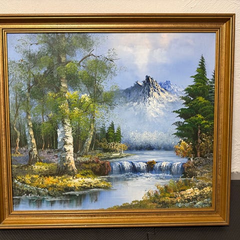 Maleri Landskap med elv og fjell