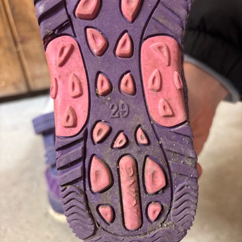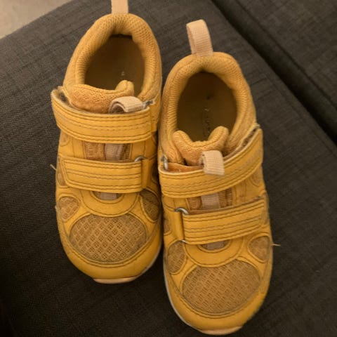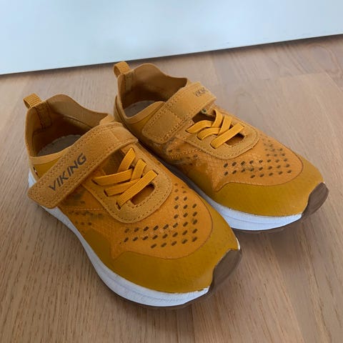 Litt slitt fremme. På den ene skoen har det svarte i sålen løsnet litt. Fortsatt mye bruk igjen