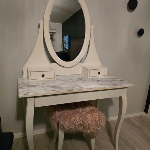 Det er nok av plass til sminke og smykker i de to små skuffene og i den store skuffen skjult under sminkebordet.