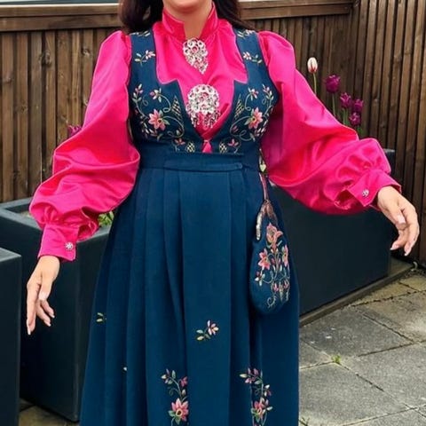 Legg merke at halsen på kjolen er ikke så vid og dyp som på bildet. Jeg fikk den laget mer modest.