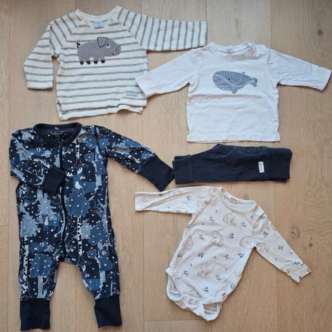 Sommer/sydenpakke med en t-skjorte,en kort pysj, 4 bodyer som er kortermet ,en body som er langermet, en solhatt og en snekkerbukse.