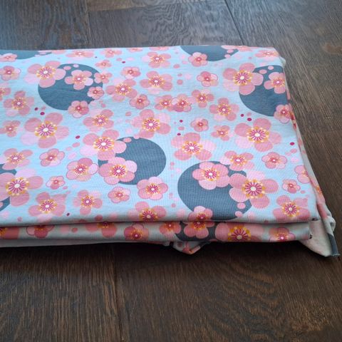 Stoff med blå bakgrunn og mønster av store blomster i rosa og beige toner. Stoffet har et naturlig og dekorativt design som kan brukes til eks kjole, skjørt, overdeler eller annet til elastisk stoff.
