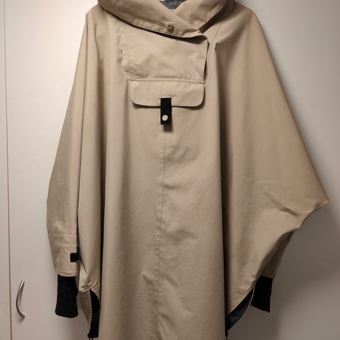Pent brukt regnponcho. Slitt logo på ermet. Ved interesse spør gjerne om flere bilder.