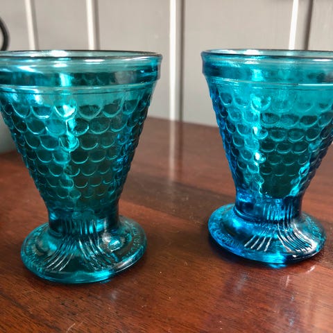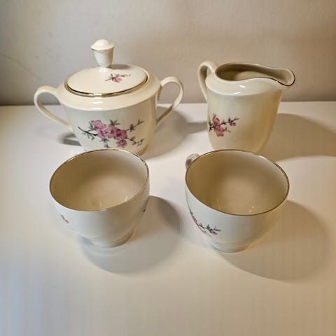 Har 2 te kopper og 1 underfat, ene koppen har hakk og den andre har krakelering og missfarge i bunnen.