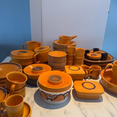 Stavanger flint. June Dekor Rolf. kaffekopp med skål i steintøy materiale. Koppen har et blomstermotiv i oransje, grønt og gult. Passer til servering av kaffe eller te.