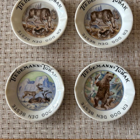 Krusene er i meget pen stand, med klar og tydelig dekor. Den ene koppen ser ubrukt ut, men den andre har noen bruksmerker på emaljen. Et flott og velbevart samlerobjekt. Høyde 7,5 cm diameter 7 cm