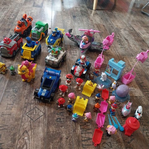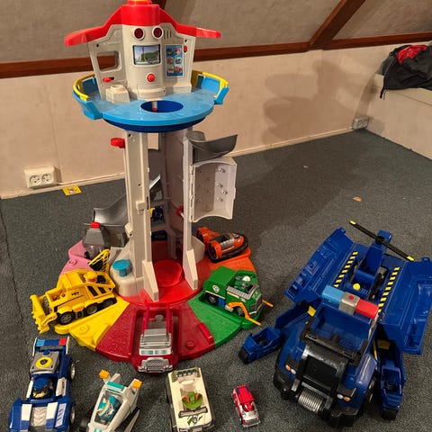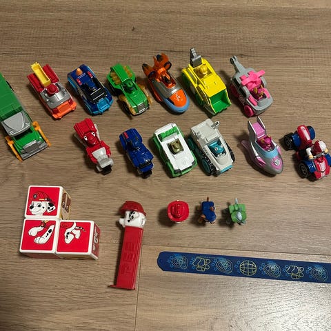 Paw Patrol barnleker med ulike kjøretøy og figurer. Inkluderer båter, biler, helikopter og flere karakterer fra serien. Passer for barn som liker lek med små figurer og kjøretøy.