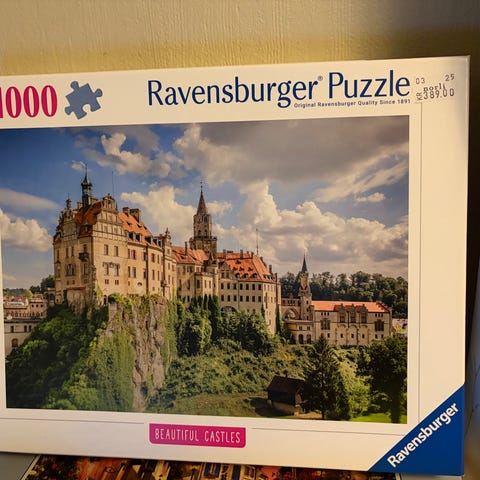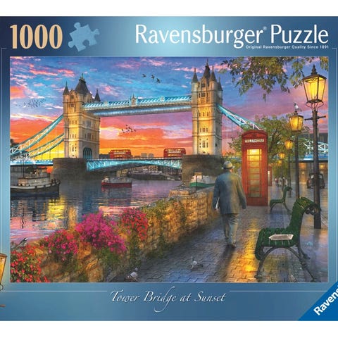 Puslespill med bilde av en katedral ved elven i solnedgang. 1500 biters