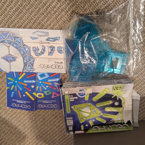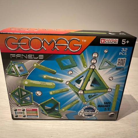 Geomag magnetisk byggeklosser sett med fargerike firkantede og trekantede brikker i forskjellige størrelser. Passer til konstruksjonsleker for barn.